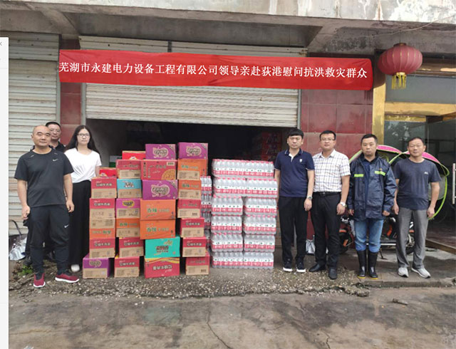 7月14日上午,蕪湖永建電力設(shè)備工程有限公司領(lǐng)導(dǎo)親赴荻港慰問抗洪救災(zāi)群眾,為他們送去方便食品、礦泉水等物資。